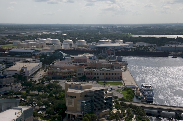 Beyond the cruise ship berths and Garrison Channel, views reach from the south west to the south east across Davis Islands, Harbour Island and the main commercial Port of Tampa Bay.